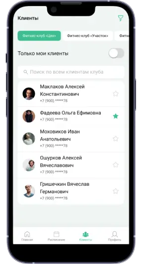 помогает тренерам назначать тренировки и вести клиентов