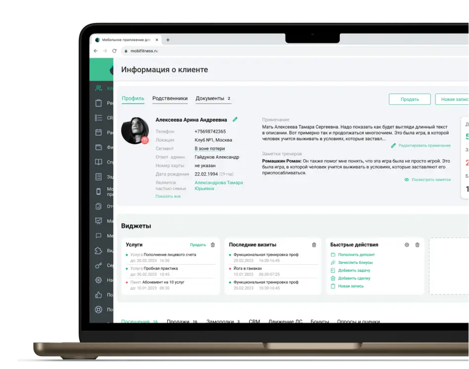 Все полезные функции в одной системе и их полная интеграция друг с другом: учетная система, мобильное приложение для клиента, мобильное приложение для тренера, онлайн-запись для сайта и социальных сетей, онлайн-платежи