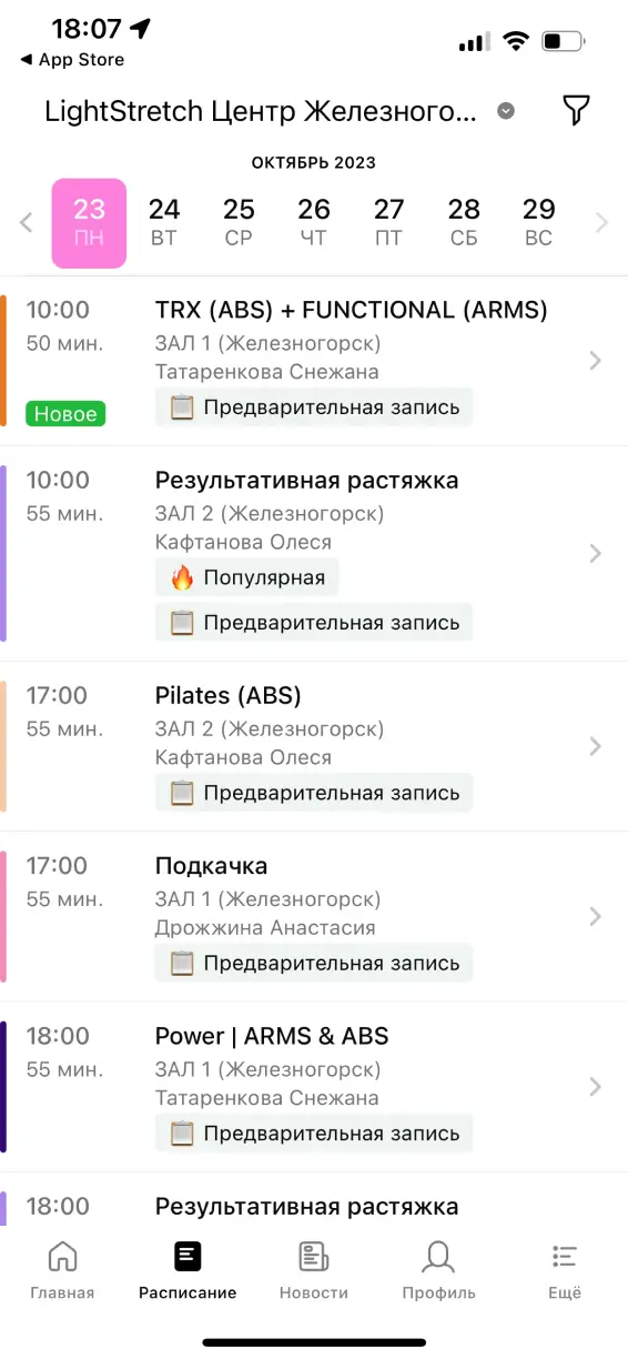 - Фильтры по времени, занятиям, направлениям и тренерам