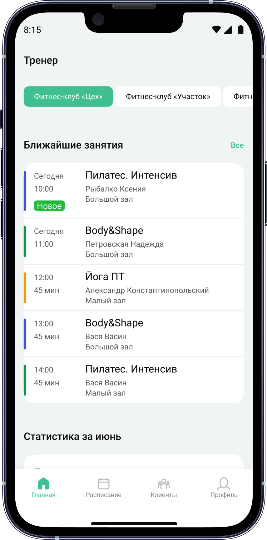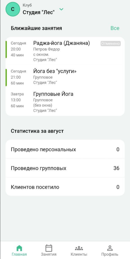 На главном экране расположены блоки ближайших занятий пользователя и блок статистики за текущий месяц.