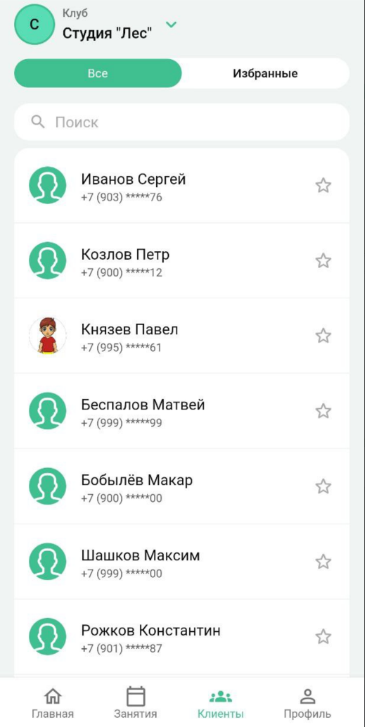 - Пользователь имеет возможность добавлять клиентов в список избранных, чтобы иметь к ним быстрый доступ. При создании занятия пользователь может выбирать клиентов как из списка избранных, так и из общего списка клиентов.