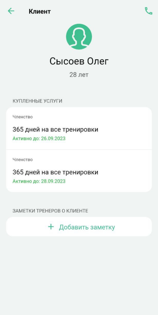 - В карточке клиента отображена краткая информация о клиенте, купленные услуги, заметки о клиенте, а также есть возможность позвонить клиенту.