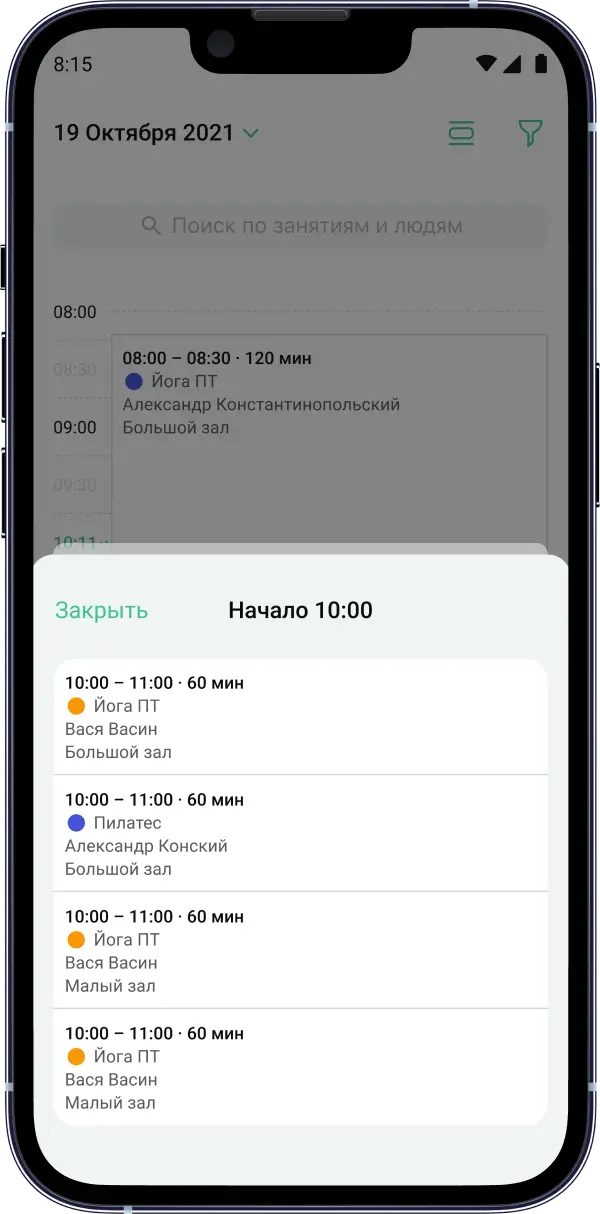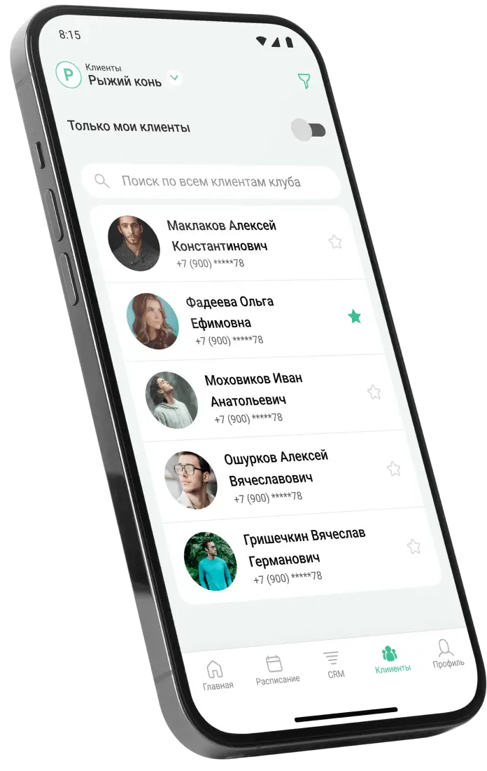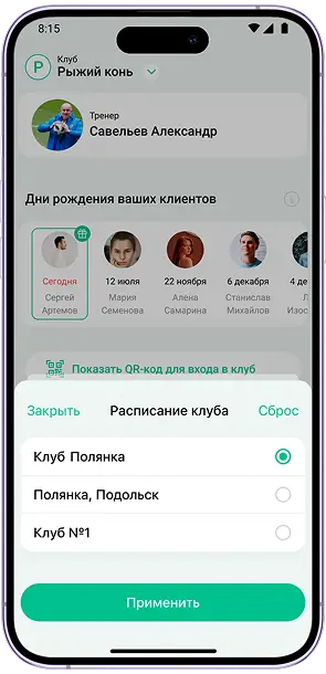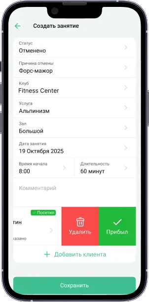 - Вся информация о клиентах в личном смартфоне инструктора. Отметить посещение, отменить или перенести тренировку возможно в один клик. Все синхронизируется с учетной системой