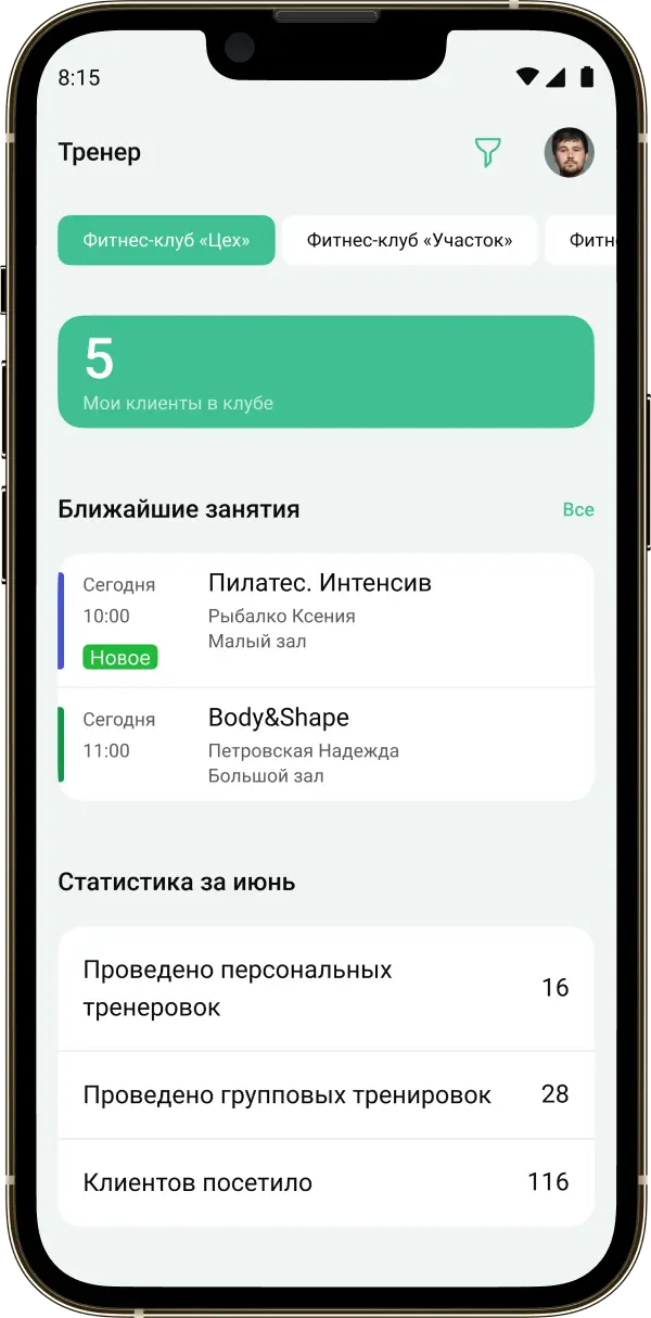 С помощью приложения тренер может оставаться на быстрой связи со своими клиентам и мотивировать ходить на занятия стабильно: после окончания тренировки сразу договориться о следующей и записать в один клик. Получить уведомления, если клиент отменил или перенес запись, уточнить причины и договориться о новом визите